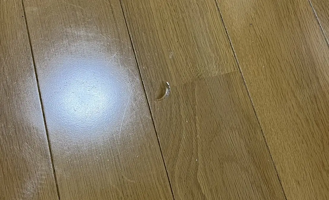 フローリングに重たい物を落としてしまったようで、若干大きめの凹み傷が出来てしまっていました。